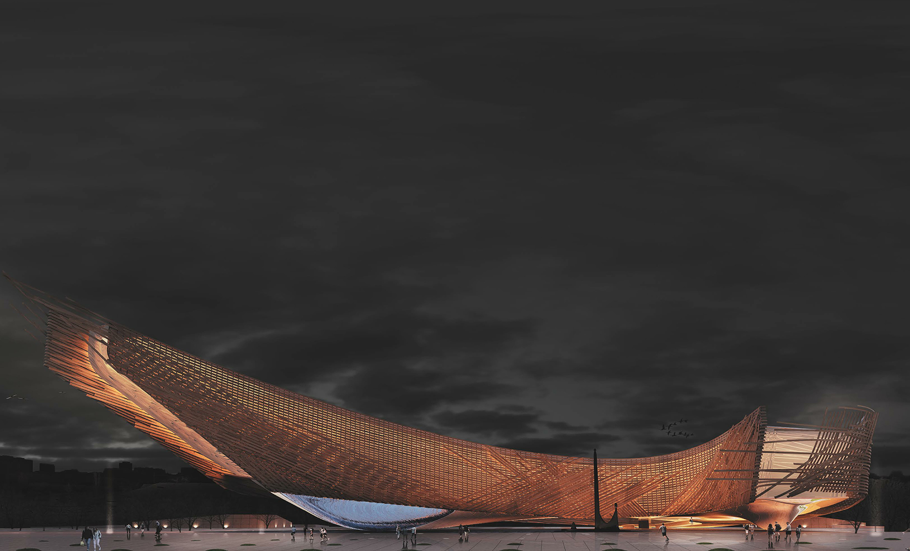 The idea of a harmonious combination of cultural heritage and new tendencies in art has arisen here. Historically on the place where earlier the Republican stadium was located, long time ago there was Haymarket Square. As origins from the name, there the hay was prepared and sold. It has become a starting point in the project and has been expressed in structure of facades. The well-known phrase - "The architecture is the spellbound music" has inspired to create the image of traditional Moldavian musical instruments. This way the image of Nay has appeared - this is the traditional instrument for folk and modern music. The instrument has become famous far outside Moldova thanks to the Moldavian musicians. Melodious sound of a wind instrument has found reflection in smooth lines of the building. It is torn off from the earth, skyward and weightless thanks to big consoles and glazing in his lower part, it as if soars over a water smooth surface.